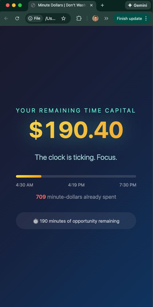Need a productivity calculator? Check this out. I built this yesterday. It physically counts down the dollars I’m losing every second I waste. (Time invested: 45 seconds)