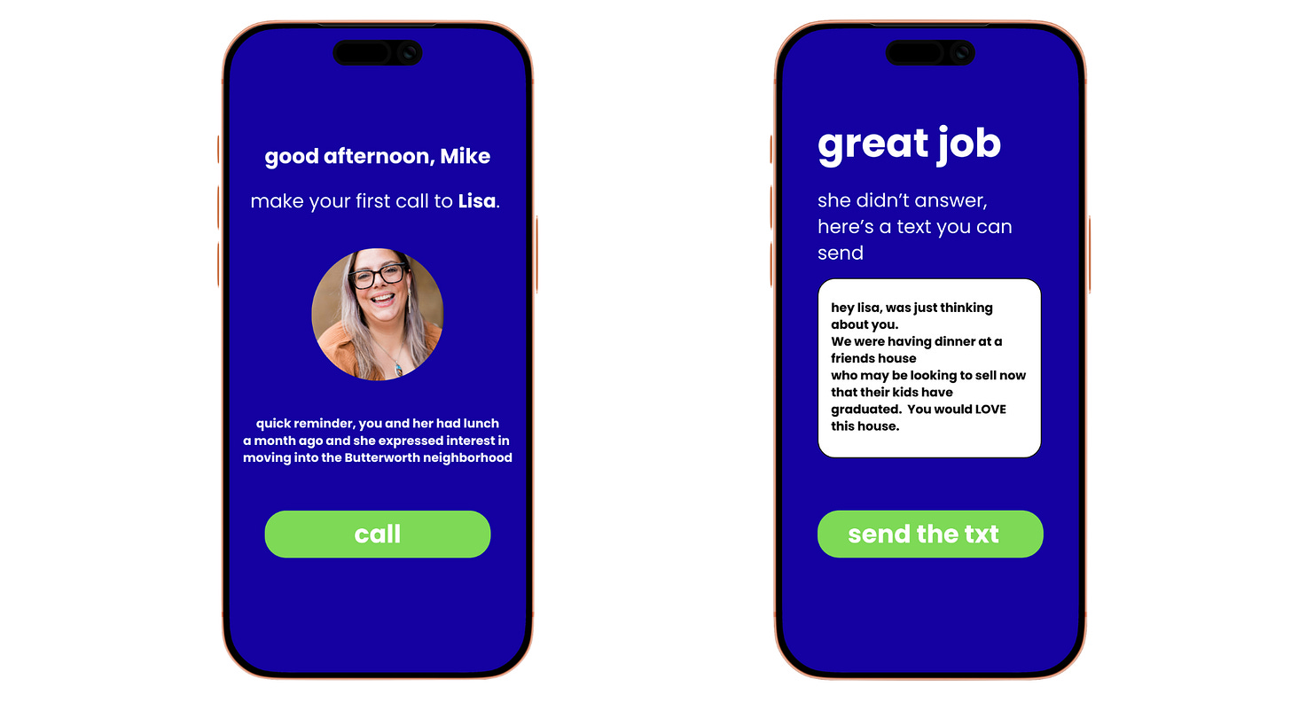 A screen that is one solid, calming color. Big text: “Call Lisa.” Context (fed by AI): “Ask about her kid’s soccer game.” One giant button. You press it, it dials. You hang up, you swipe right. Tinder for Prospecting…?