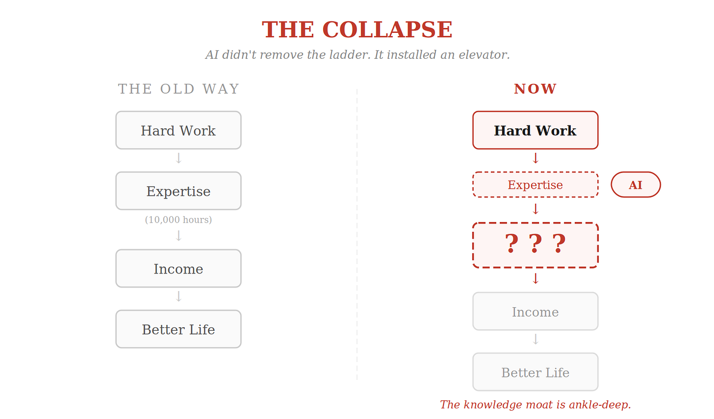 A first-year employee can write code, draft contracts, and build financial models that previously required a decade of pattern recognition.